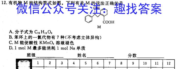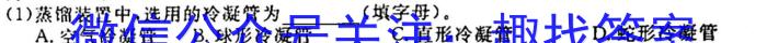 12.有机物M的结构简式如图。下列有关M的说法正确的是A.分子式为C15H13O3B.苯环上的一氯代物有7种(不考虑立体异构)C.M能使酸性KMnO4溶液褪色D.1molM最多能消耗1molNa单质班级姓名分数(1))蒸馏装置中,选用的冷凝管为(填字母)。A.空气冷凝管B.球形冷凝管C.直形冷凝管D.蛇形冷凝管
