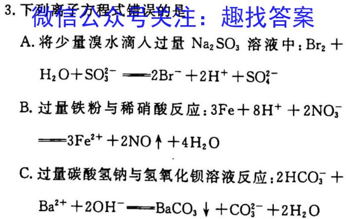 3.下列离子方程式错误的是A.将少量溴水滴人过量Na2SO3溶液中:Br2+H2O+SO3^2-2Br^-+2H^++SO4^2-B.过量铁粉与稀硝酸反应:3Fe+8H^++2NO3^-=3Fe^2++2NO+4H2OC.过量碳酸氢钠与氢氧化钡溶液反应:2HCO3^-+Ba^2++2OH^-BaCO3+CO3^2-+2H2OD.将葡萄糖溶液与足量银氨溶液共热:CH2OH(CHOH)4CHO+2[Ag(NH3)2]^++2OH^-[]CH2OH(CHOH)4COO^-+NH4^++2Ag+3NH3+H2O