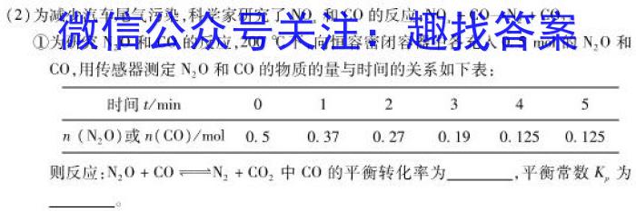 (2)为减少汽车尾气污染,科学家研究了NOx和CO的反应:NOx+CON2+CO2。①为研究N2O和CO的反应,200^C下,向恒容密闭容器中各充人0.5mol的N2O和CO,,用传感器测定N2O和CO的物质的量与时间的关系如下表:则反应:N2O+CON2+CO2中CO)的平衡转化率为,平衡常数Kp为。