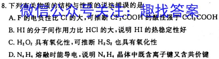 8.下列有关物质的结构与性质的说法错误的是A.F的电负性比Cl的大,可推断CF3COOH的酸性强于CCl3COOHB.HI的分子间作用力比FCl的大,说明HI的热稳定性好C.H2O2具有氧化性,可推断H2S2也具有氧化性D.N4H4熔融时能导电,说明N4H4晶体中既含离子键又含共价键