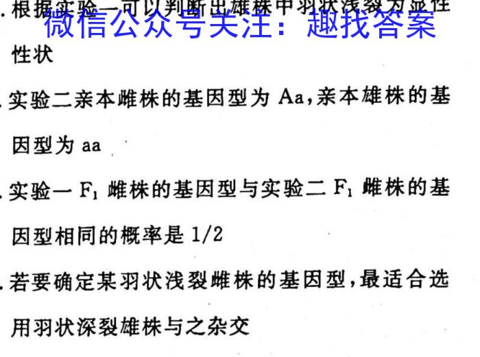 6.某雌雄异株的植物的叶片有羽状浅裂和羽状深裂两种类型,雌株叶片都是羽状浅裂,叶形由基因A、a控制。某小组做了如图所示的杂交实验。下列相关叙述正确的是PA.根据实验一可以判断出雄株中羽状浅裂为显性性状B.实验二亲本雌株的基因型为Aa,亲本雄株的基F1雌株的基因型为aaC.实验一雌株的基因型与实验二F1因型相同的概率是1/2D.若要确定某羽状浅裂雌株的基因型,最适合选用羽状深裂雄株与之杂交