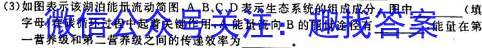 (3)如图表示该湖泊能量流动简图,A、B、C、D表示生态系统的组成成分。图中(填字母)在碳循环过程中起着关键作用,A能量流向B的能址途径有。图中,能计在第一营养级和第二营养级之间的传递效率为。