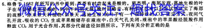 6.格鲁于1682年所写的书中提到:芦荟有时尝起来是酸的。班杰明·海那发现:落地生根的叶子在早晨嚼起来是酸的,到中午时则无味,晚时则略苦,有科学家后来以石蕊试纸证实了海那的观察,原来景天科植物(如景天、落地生根)的叶子有一个很特殊的CO2固定方式:夜间气孔开放,吸收的CO2生成苹果酸储存在液泡中,白天气孔关闭,液泡中的苹果酸经脱羧作用释放CO2用于光合作用,其部分代谢途径如图所示。下列有关分析正确的是A.如果白天适当提高CO2,浓度,景天科植物的光合作用速率将随之提高B.由景天科植物特殊的CO2固定方式推测其可能生活在高温干旱地区C.白天景天科植物叶肉细胞内有机酸和葡萄糖的含量可能呈正相关D.景天科植物参与卡尔文循环的CO2就是来源于苹果酸的分解