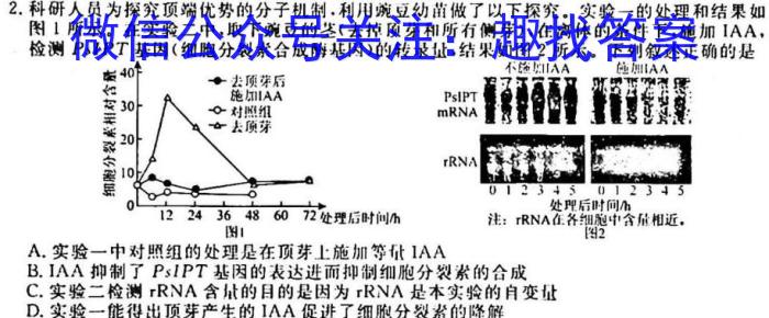 2.科研人员为探究顶端优势的分子机制,利用豌豆幼苗做了以下探究。实验一的处理和结果如图1所示。在实验二中,取下豌豆的茎(去掉顶芽和所有侧芽),在离体的条件下,施加IAA检测PslPT基因(细胞分裂素合成酶基因)的转录量,结果如图2所示。下列叙述正确的是不施加IAA睡加IAAA.实验一中对照组的处理是在顶芽上施加等量1AAB.IAA抑制了PslPT基因的表达进而抑制细胞分裂素的合成C.实验二检测rRNA含量的目的是因为rRNA是本实验的自变量D.实验一能得出顶芽产生的IAA促进了细胞分裂素的降解