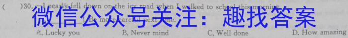 ( ) 30.-I n early fell down on the icy road when I walked to school this morning.- ! Be more careful next time.____A. Lucky you B.Never mind C.Well done D.How amazing