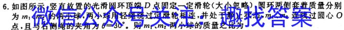 6.如图所示,竖直放置的光滑圆环顶端D点固定一定滑轮(大小忽略),圆环两侧套着质量分别为n1、m2的两小球,两小球用轻绳绕过定滑轮相连,并处于静止状态,m1、m2连线过圆心O点,且与右侧绳的夹角为=30^。,则m1、m2两小球的质量之比为A.33B.3D.1