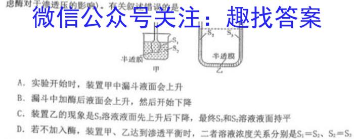 虑酶对于渗透压的影响)。有关叙述错误的是A.实验开始时,装置甲中漏斗液面会上升B.漏斗中加酶后液面会上升,然后开始下降C.装置乙的现象是S3溶液液面先上升后下降,最终S2和S2溶液液面持平D.若不加入酶,装置甲、乙达到渗透平衡时,二者溶液浓度关系分别是S1=S2、S2=S3