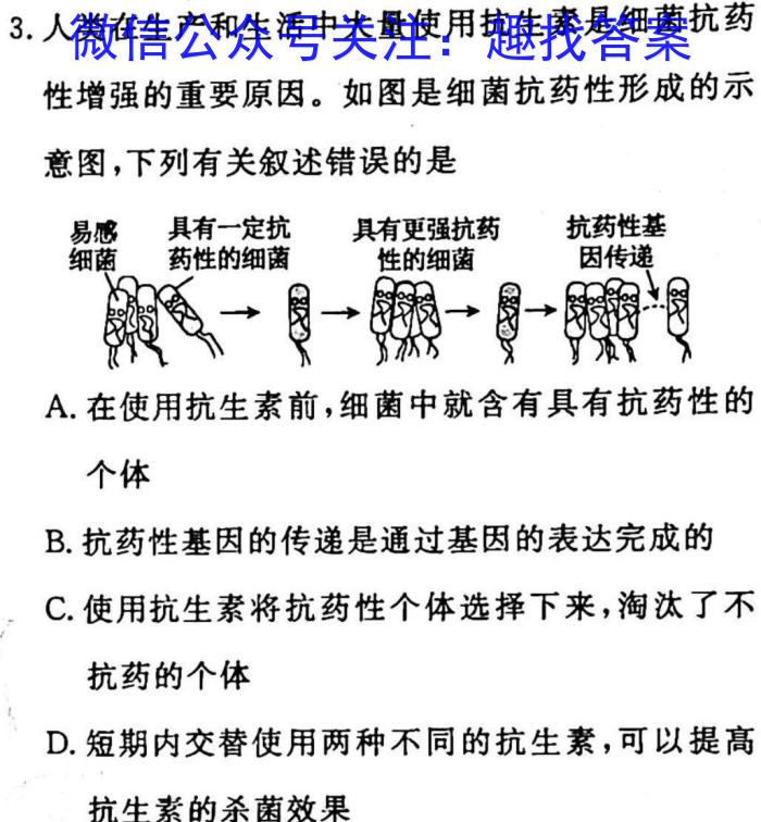 3.人类在生产和生活中大量使用抗生素是细菌抗药性增强的重要原因。如图是细菌抗药性形成的示意图,下列有关叙述错误的是A.在使用抗生素前,细菌中就含有具有抗药性的个体B.抗药性基因的传递是通过基因的表达完成的C.使用抗生素将抗药性个体选择下来,淘汰了不抗药的个体D.短期内交替使用两种不同的抗生素,可以提高抗生素的杀菌效果