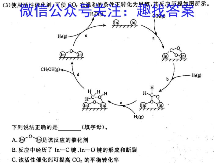 (3)使用活性催化剂,可使CO2在温和的条件下转化为甲醇,其反应历程如图所示。下列说法正确的是(填字母)。是该反应的催化剂B.反应中经历了In-C键、In-C)键的形成和断裂C.该活性催化剂可提高CO2的平衡转化率