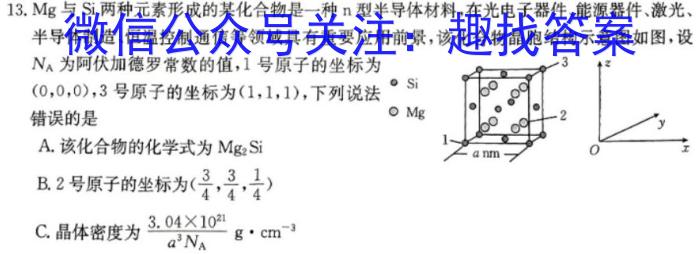 13.Mg与Si两种元素形成的某化合物是一种n型半导体材料,在光电子器件、能源器件、激光、半导体制造、恒温控制通信等领域具有重要应用前景,该化合物晶胞结构示意图如图,设NA为阿伏加德罗常数的值,1号原子的坐标为(0,0,0),3号原子的坐标为(1,1,1),下列说法错误的是A.该化合物的化学式为Mg2SiB.2号原子的坐标为(34,34,14)C.晶体密度为3.0410^21a^3NAgcm^-3