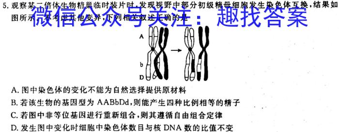 5.观察某二倍体生物精巢临时装片时,发现视野中部分初级精母细胞发生染色体互换,结果如图所示。不考虑其他变异,下列相关叙述正确的是A.图中染色体的变化不能为自然选择提供原材料B.若该生物的基因型为AABbDd,则能产生四种比例相等的精子C.若图中非等位基因进行重新组合,则其遵循自由组合定律D.发生图中变化时细胞中染色体数目与核DNA数的比值不变