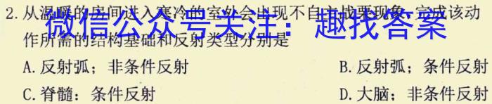 2.从温暖的房间进入寒冷的室外会出现不自主战栗现象,完成该动作所需的结构基础和反射类型分别是A.反射弧;非条件反射B.反射弧;条件反射C.脊髓:条件反射D.大脑;非条件反射
