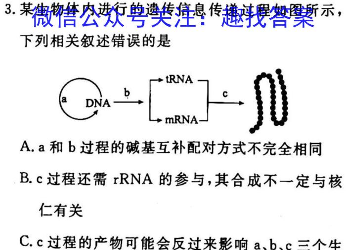 3.某生物体内进行的遗传信息传递过程如图所示,下列相关叙述错误的是A.a和b过程的碱基互补配对方式不完全相同B.c过程还需rRNA的参与,其合成不一定与核仁有关C.c过程的产物可能会反过来影响a、b、c三个生理过程D.mRNA上的密码子与rRNA上的反密码子不是完全对应关系