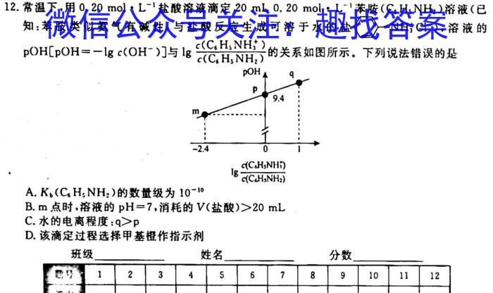 12.常温下,用0.20molL^-1盐酸溶液滴定20mL0.20molL^-苯胺(C6H5NH2)溶液知:苯胺类似氨气有碱性,与盐酸反应生成可溶于水的盐盐-NNH3^+Cl^-),,溶液的p()H[pOH=-c(OH^-)c(C6H5NH3^+)c(C6H3NH2)的关系如图所示。下列说法错误的是A.Kb(C6H5NH2)的数量级为10^-10B.m点时,溶液的pH=7,,消耗的V((盐酸)>20mLC.水的电离程度;:q>pD.该滴定过程选择甲基橙作指示剂班级姓名分数