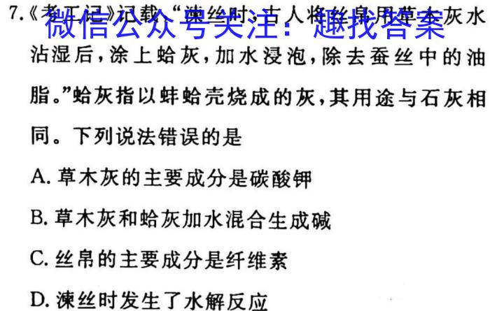 7.《考工记》记载,“丝时,古人将丝帛用草木灰水沾湿后,涂上蛤灰,加水浸泡,除去蚕丝中的油脂。”蛤灰指以蚌蛤壳烧成的灰,其用途与石灰相同。下列说法错误的是A.草木灰的主要成分是碳酸钾B.草木灰和蛤灰加水混合生成碱C.丝帛的主要成分是纤维素D.丝时发生了水解反应