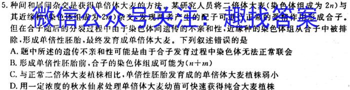 5.种间和属间杂交是获得单倍体大麦的方法。某研究人员将二倍体大麦(染色体组成为.2n)与其近缘种(染色体组成为.2m)杂交,发现两者产生的配子可进行正常的受精作用形成合子。但在合子随后的分裂过程中由于染色体间遗传的不亲和性,近缘种的染色体组从合子中被排除,形成单倍性胚胎,最终发育成单倍体大麦。下列叙述错误的是A.题中所述的遗传不亲和性可能是由于合子发育过程中染色体无法正常联会B.形成单倍性胚胎前,合子的染色体组成可能为(n+m)C.与正常二倍体大麦植株相比,单倍性胚胎发育成的单倍体大麦植株弱小D.用一定浓度的秋水仙素处理单倍体大麦幼苗可快速获得纯合大麦植株