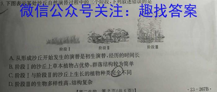 9.下图表示某处沙丘自然演替过程中的三个阶段,下列叙述错误的是A.从形成沙丘开始发生的演替是初生演替,经历的时间长B.阶段I的沙丘上草本植物占优势,群落结构较为简单C.阶段I与阶段Ⅱ的沙丘上生长的植物类完全不同D.阶段Ⅲ的生物多样性高,结构复杂
