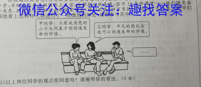 烧,为大山女孩点亮希望的灯;王亚平迈出中国女性舱外太空行走第一变,开时刻准备为祖国再上太空;徐梦桃四战冬奥,坚守16年终圆梦…..她们擦亮态士底色,把理想追求融入党和国家事业,她们就是“四万里挑一”的二十大代表。同学们围绕着上述榜样人物进行了一次激烈的辩论,请你参与其中。(3)以上两位同学的观点你同意吗?请阐明你的看法。(6分)