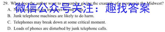 29.What does the author want to present by giving the example of a woman in the Midwest?A.Nice neighbors are treasures in one’s life.B.Junk telephone machines are likely to do harm.C.Telephones may break down at some critical moment.D.Loads of phones are disturbed by junk telephone calls.