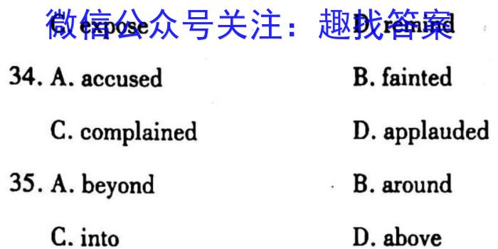 C.expose D.remind34.A.accused B.faintedC.complained D.applauded35.A.beyond B.aroundC.into D.above