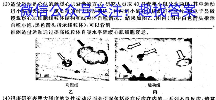 (3)适量运动是公认的延缓心肌衰老的方式,研究人员取40只青年小鼠分为两组,其中运动组小鼠每天进行一定负荷的耐力运动训练。将两组小鼠心肌组织进行切片,用电子显微镜观察心肌细胞线粒体结构和线粒体自噬情况。结果如图乙、图丙(图中白色箭头指示自噬小泡,黑色箭头指示线粒体),可以看到推测适量运动通过提高线粒体自噬水平延缓心肌细胞衰老。