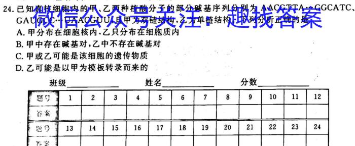 24.已知真核细胞内的甲、乙两种**分子的部分碱基序列分别为AACGTTA⋯GGCATC、GAUGCC⋯UAACGUU,,且甲为双链结构,乙为单链结构。下列分析正确的是A.甲分布在细胞核内,乙只分布在细胞质内B.甲中存在碱基对,乙中不存在碱基对C.甲或乙可能是该细胞的遗传物质D.乙可能是以甲为模板转录而来的分数(1)步骤一中将大肠杆菌在含^5N、^13C、^13P-U的培养基中培养若干代的目的是。