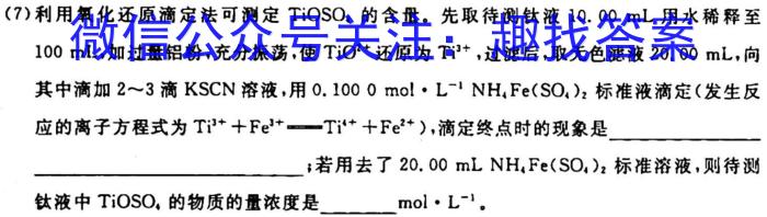 (7)利用氧化还原滴定法可测定TiOSO的含量。先取待测钛液10.00mL用水稀释至100mL,加过量铝粉,充分振荡,使TiO^2-*还原为T1i,过滤后,取无色滤液20.00mL,向其中滴加2∼3滴K.SCN溶液,用0.1000molL^-1NH4Fe(SO4)2标准液滴定(发生反应的离子方程式为i^3++Fe^3+Ti^4++Fe^2+),滴定终点时的现象是;若用去了20.00mLNH4Fe(SO4)2标准溶液,则待测钛液中TiOSO4的物质的量浓度是molL^-1。