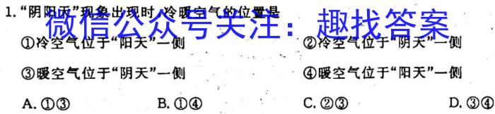 1.“阴阳天”现象出现时,冷暖空气的位置是①冷空气位于“阳天”一侧②冷空气位于“阴天”一侧③暖空气位于“阴天”一侧④暖空气位于“阳天”一侧A.①③B.①④C.②③D.③④
