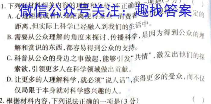 1.下列对材料相关内容的理解和分析,不正确的一项是(3分)()A.心理距离或者认知距离使得某些“消费者”觉得跟科学有一定的距离,但实际上科学已经融入到我们的生活中。B.需要从公众理解的角度来探讨、传播科学,是因为得到公众的理解和赏识的东西,都容易得到公众的支持。C.科普从公众的身边之事做起,能够引发“共情”,激发出他们的探索欲,引领更多人在科学领域做出贡献。D.让更多的人理解科学,就必须“说人话”,获得更多的受众,而不仅仅局限于本身就对科学感兴趣的人。()