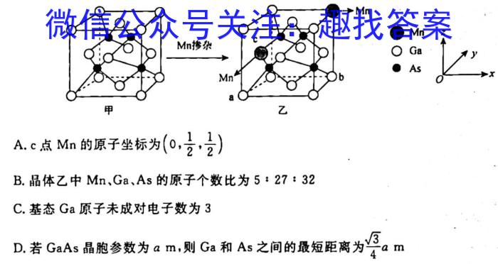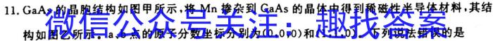 11.GaAs的晶胞结构如图甲所示,将Mn掺杂到的晶体中得到稀磁性半导体材料,其结构如图乙所示。a、b点的原子分数坐标分别为(0,0,0)和(1,1,0)。下列说法错误的是A.c点Mn的原子坐标为(0,12,12)B.晶体乙中Mn、Ga、As的原子个数比为5:27:32C.基态Ga原子未成对电子数为3D.若GaAs晶胞参数为am,则Ga和As之间的最短距离为34am