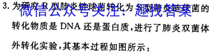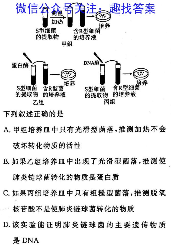 3.为研究R型肺炎链球菌转化为S型肺炎链球菌的转化物质是DNA还是蛋白质,进行了肺炎双菌体外转化实验,其基本过程如图所示:下列叙述正确的是A.甲组培养皿中只有光滑型菌落,推测加热不会破坏转化物质的活性C.如果丙组培养皿中只有粗糙型菌落,推测脱氧D.该实验能证明肺炎链球菌的主要遗传物质是DNAB.如果乙组培养皿中出现了光滑型菌落,推测使肺炎链球菌转化的物质是蛋白质核苷酸不是使肺炎链球菌转化的物质