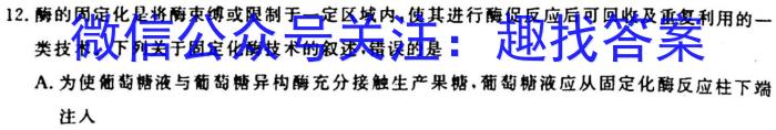 12.酶的固定化是将酶束缚或限制于一定区域内,使其进行酶促反应后可回收及重复利用的一类技术,下列关于固定化酶技术的叙述,错误的是A.为使葡萄糖液与葡萄糖异构酶充分接触生产果糖,葡萄糖液应从固定化酶反应柱下端注人B.制备固定化酶的方法主要有化学结合法和物理吸附法C.固定化酶固定时可能会对酶造成损伤而影响其活性D.用固定化葡萄糖异构酶生产高果糖浆可以大幅度提高产量
