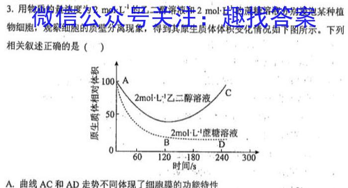 3.用物质的量浓度为2molL^-1的乙二醇溶液和2molL^-1的蔗糖溶液分别浸泡某种植物细胞,观察细胞的质壁分离现象,得到其原生质体体积变化情况如下图所示。下列相关叙述正确的是()A.曲线AC和AD走势不同体现了细胞膜的功能特性B.120s后乙二醇进入该植物细胞C.该植物的所有活细胞都能发生质壁分离D.通常能发生质壁分离的细胞也可发生DNA复制、转录和翻译过程
