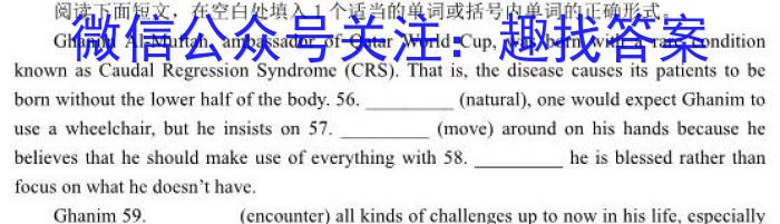 阅读下面短文,在空白处填入1个适当的单词或括号内单词的正确形式。Gh anim Al-Muf tah, ambassador of Qatar World Cup, was born with a rare conditionknown as Caudal Regression Syndrome (CRS) . That is, the disease causes its patients to beborn without the lower half of the body. 56. (natural) , one would expect Ghanim to________use a wheelchair, but he insists on 57. (move) around on his hands because hebelieves that he should make use of everything with 58. he is blessed rather than____focus on what he doesn’t have.