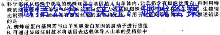 6.科学家将从蜘蛛中获取的蜘蛛丝蛋白基因植人山羊体内,让羊奶含有蜘蛛丝蛋白,再利用特殊的纺丝程序,将羊奶中的蜘蛛丝蛋白纺成人造基因蜘蛛丝,这种丝又称为生物钢。生物钢比钢强4至5倍,而且具有如蚕丝般的柔软和光泽,可用于制造高级防弹衣。下列叙述错误的是是A.蜘蛛丝蛋白基因需与山羊乳腺蛋白基因的启动子进行重组B.可通过显微注射技术将基因表达载体导人山羊的受精卵中C.检测目的基因是否转录,用PCR直接扩增山羊的mRNA即可D.生物钢不仅强度大,还可以被生物降解,不会造成环境污染