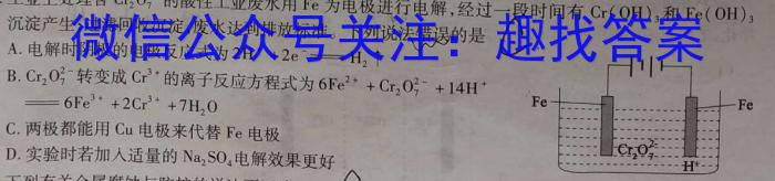 Cr2O7^2-的酸性工业废水用Cr(OH)38.工业上处理含Fe为电极进行电解,经过一段时间有和Fe(OH)3沉淀产生;过滤回收沉淀,废水达到排放标准。下列说法错误的是CA.电解时阴极的电极反应式为2H^++2e^-H2B.Cr2O7^2-转变成Cr^3+*的离子反应方程式为6Fe^2++Cr2O7^2-+14H^+6Fe^3++2Cr^3++7H2OC.两极都能用Cu电极来代替Fe电极D.实验时若加入适量的Na2SO4电解效果更好