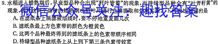9.水稻进入蜡熟期后,早衰型品种会出现“籽叶皆黄”的现象,而持绿型品种会有“叶青籽黄”的现象,现对这两个品种的蜡熟期水稻叶片进行色素提取和分离实验。下列说法错课的是A.在滤纸条上画滤液细线时,要不停地重复画几次B.滤纸条最上方色素带的颜色为橙黄色C.这两个品种最终得到的滤纸条上的色素带顺序相同D.持绿型品种滤纸条上从上到下第三条色素带较宽