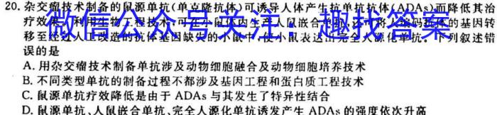 20.杂交瘤技术制备的鼠源单抗(单克隆抗体)可诱导人体产生抗单抗抗体(ADAs)而降低其治疗效果。利用生物工程技术,可在小鼠体内生产人鼠嵌合单抗,还可将人编码抗体的基因转移至经过人工改造的抗体基因缺失的小鼠中,使小鼠表达出完全人源化单抗。下列叙述错误的是A.用杂交瘤技术制备单抗涉及动物细胞融合及动物细胞培养技术B.不同类型单抗的制备过程不都涉及基因工程和蛋白质工程技术C.鼠源单抗疗效降低是由于ADAs与其发生了特异性结合D.鼠源单抗、人鼠嵌合单抗、完全人源化单抗诱发产生ADAs的强度依次升高