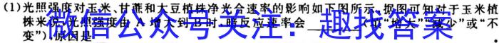(1)光照强度对玉米、甘蔗和大豆植株净光合速率的影响如下图所示,据图可知对于玉米植株来说,光照强度由A增大到B时,暗反应速率会(填“增大”“减少”或“不变”),原因是