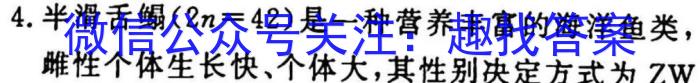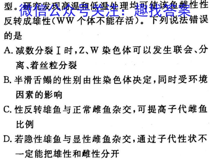 4.半滑舌鳊(2n=42)是一种营养丰富的海洋鱼类,雌性个体生长快、个体大,其性别决定方式为Zw型。研究发现高温和低温处理均可使该鱼雌性性反转成雄性(个体不能存活)。下列说法错误的是A.减数分裂I时,Z、W染色体可以发生联会、分离、着丝粒分裂B.半滑舌竭的性别由性染色体决定,同时受环境因素的影响C.性反转雄鱼与正常雌鱼杂交,可提高子代雌鱼比例D.若隐性雄鱼与显性雌鱼杂交,通过子代性状不一定能把雄性和雌性分开