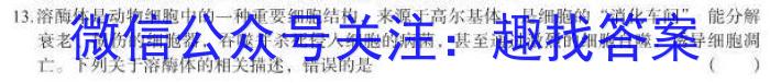 13.溶酶体是动物细胞中的一种重要细胞结构,来源于高尔基体,是细胞的“消化车间”,能分解衰老、损伤的细胞器,吞噬并杀死侵人细胞的病菌,甚至通过激烈的细胞自噬,诱导细胞凋亡。下列关于溶酶体的相关描述,错误的是细()A.溶酶体中的水解酶由核糖体合成、由内质网和高尔基体加工成熟B.被溶酶体分解后的产物,有用物质可被再利用,废物会被排出细胞外C.溶酶体膜不被溶酶体所含的水解酶水解,可能是由于膜成分被修饰D.细胞处于正常状态时,溶酶体对细胞内自身结构不起“消化”作用