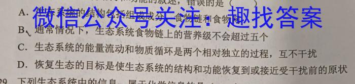 28.下列有关生态系统结构和功能的叙述,错误的是()A.生态系统的结构包括组成成分、食物链和食物网通常情况下,生态系统食物链上的营养级不会超过五个C.生态系统的能量流动和物质循环是两个相对独立的过程,互不千扰D.恢复生态的目标是使生态系统的结构和功能恢复到或接近受干扰前的原状
