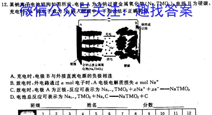 12.某钠离子电池结构如图所示,电极A为含钠过渡金属氧化物(NaxTMO2),,电极B为硬碳,充电时Na^+得电子成为Na嵌入硬碳中。下列说法不正确的是A.充电时,电极B与外接直流电源的负极相连B.放电时,外电路通过amol电子时,A电极电解质损失amolNa^+C.放电时,电极A为正极,反应可表示为Na1-xMMO2+xNa^++xe^-NaTMO2D.电池总反应可表示为Na1-xIMO2+Na2CNaTMO2+C(1)A是直流电源的(填“正极”或“负极”)。