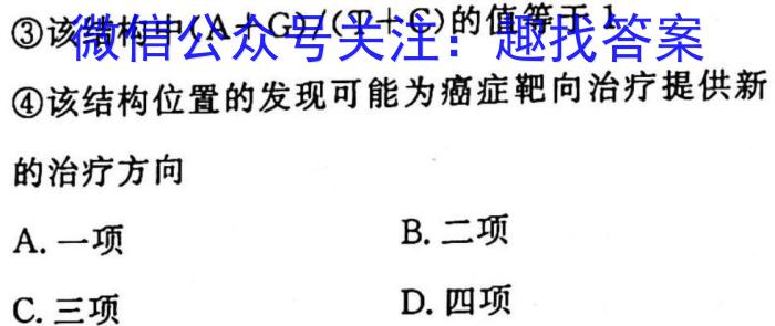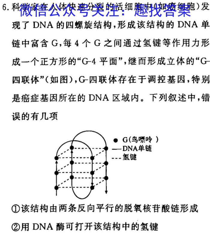6.科学家在人体快速分裂的活细胞中(如癌细胞)发现了DNA的四螺旋结构,形成该结构的DNA单链中富含G,每4个G之间通过氢键等作用力形成一个正方形的“G-4平面”,继而形成立体的“G四联体”(如图),G四联体存在于调控基因,特别是癌症基因所在的DNA区域内。下列叙述中,错误的有几项①该结构由两条反向平行的脱氧核苷酸链形成②用DNA酶可打开该结构中的氢键③该结构中(A+G)/(T+C)的值等于1④该结构位置的发现可能为癌症靶向治疗提供新的治疗方向A.一项B.二项C.三项D.四项