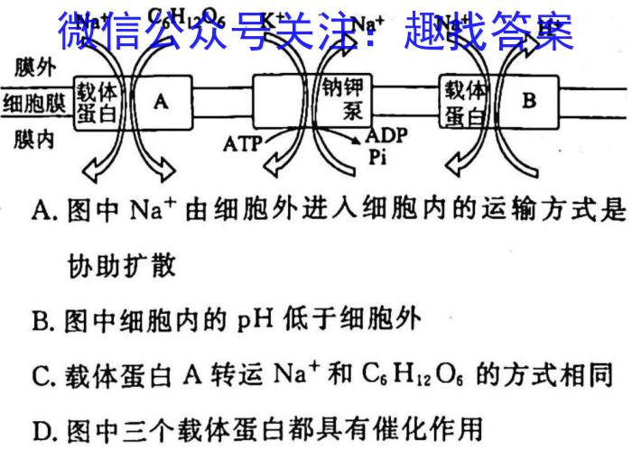 A.图中Na^+由细胞外进入细胞内的运输方式是协助扩散B.图中细胞内的pH低于细胞外C.载体蛋白A转运Na^+和C6H12O6的方式相同D.图中三个载体蛋白都具有催化作用