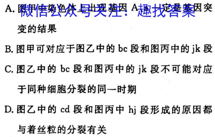 A.图甲中染色体上出现基因A、a一定是基因突变的结果B.图甲可对应于图乙中的bc段和图丙中的jk段C.图乙中的bc段和图丙中的jk段不可能对应于同种细胞分裂的同一时期D.图乙中的cd段和图丙中hj段形成的原因都与着丝粒的分裂有关