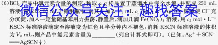 (6)BCl3产品中氯元素含量的测定:称取ag样品置于蒸馏水中完全水解,并配成250mL溶液,量取25.00mL于锥形瓶中,向其中加人V1mLc1molL^-1AgNO3溶液使Cl^-充分沉淀,加入一定量硝基苯用力振荡,静置后,滴加几滴Fe(NO3)3溶液,用c2molL^-1KSCN标准溶液滴定至溶液变为红色且半分钟内不褪色,消耗KSCN标准溶液的体积为V2mL,则产品中氯元素含量为(列出计算式即可)。(已知:Ag^++SCN^-—AgSCN↓)