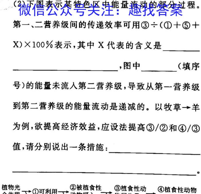 (2)下图表示某特色区中能量流动的部分过程。第一、二营养级间的传递效率可用③÷(①1⑤+X)×100%表示,其中X代表的含义是,图中(填序号)的能量未流人第二营养级,导致从第一营养级到第二营养级的能量流动是递减的。以牧草→羊为例,欲提高经济效益,应设法提高③/②和④/③值,请分别说出一条措施:。