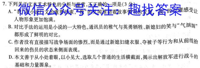 7.下列关于文本艺术特色的分析与鉴赏,不正确的一项是(3分)A.“我”是小说行文的重要线索,“我”的见闻推动着故事情节的发展,“我”的心理感受让人物形象更加饱满。B.对比手法的运用是小说的一大特色,通讯员的稚气与英勇牺牲、新媳妇的笑与“气汹汹”都形成了鲜明的对比。C.作者没有直接描写战争场面的惨烈,而是通过新媳妇缝衣服、夺被子等行为和从前线拾回来的伤员的状态来侧面表现。D.本文善于从小处着眼,以小见大,选取几个普通的生活横截面,揭示出解放军进行战斗的基础和力量源泉。