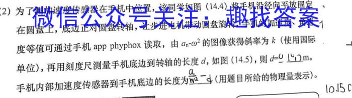 (2)为了测加速度传感器在手机中位置,该同学如图(14.4)将手机沿径向平放固定,在圆盘上,底边正对圆盘转轴,让步进电机带动圆盘旋转,手机的加速度、角速1度等值可通过手机appphyphox读取,由x读取,由an-^2的图像获得斜率为k(使用国际单位),再用刻度尺测量手机底边到转轴的长度d,如图(14.5),则d=0手机内部加速度传感器到手机底边的长度为品-1【用题目所给的物理量表示)。lo5